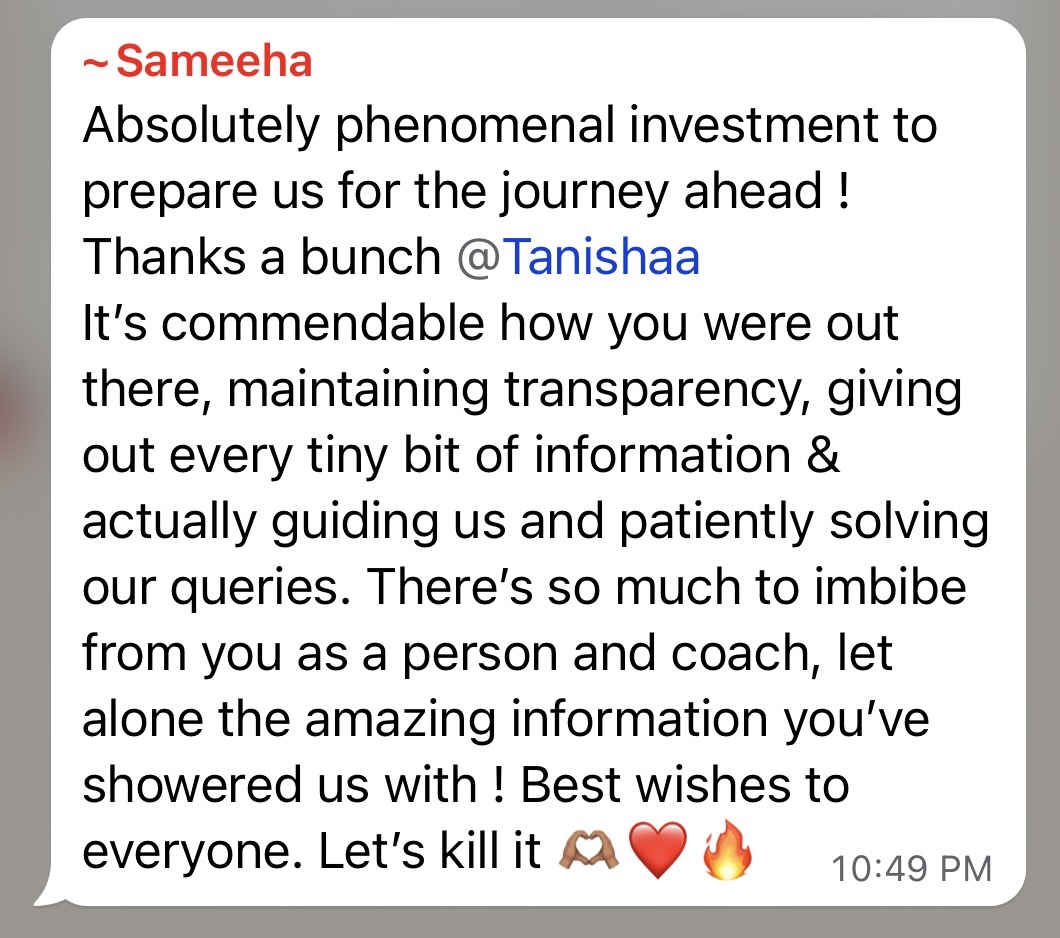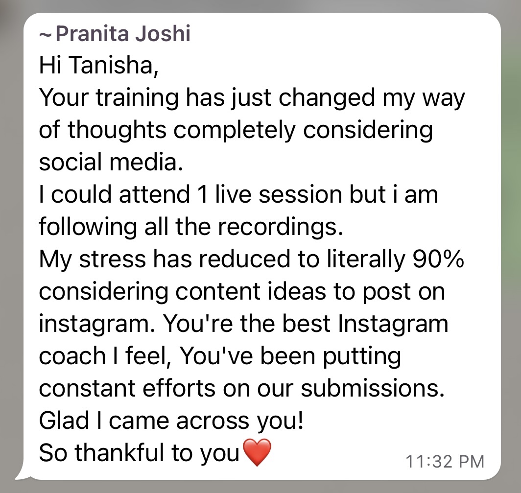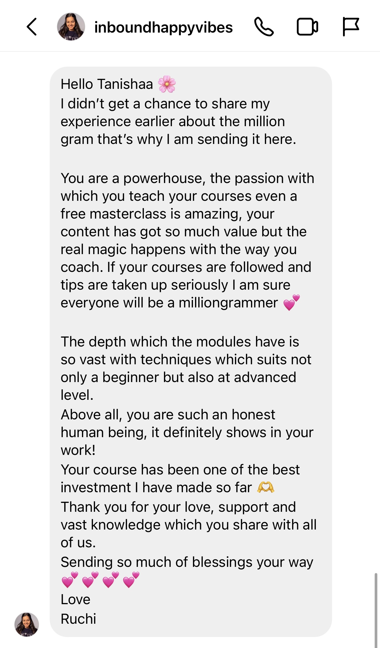 Shuchi, the founder of Khumaar says: 'I couldn't attend the last two sessions. However, with the first 3 sessions itself I took my reach from 5k to 52k. Thank you so much for this insightful and affordable course.'