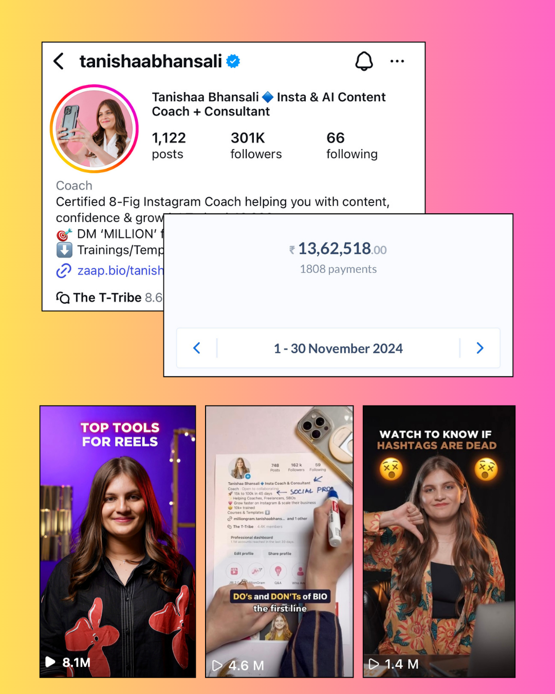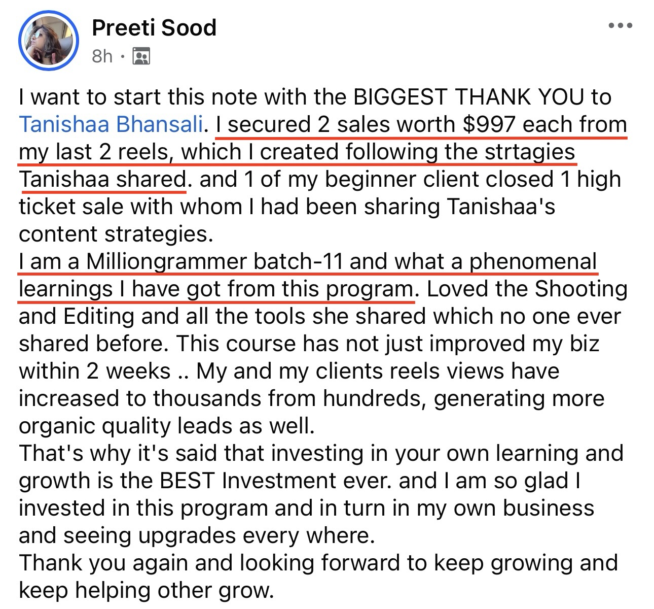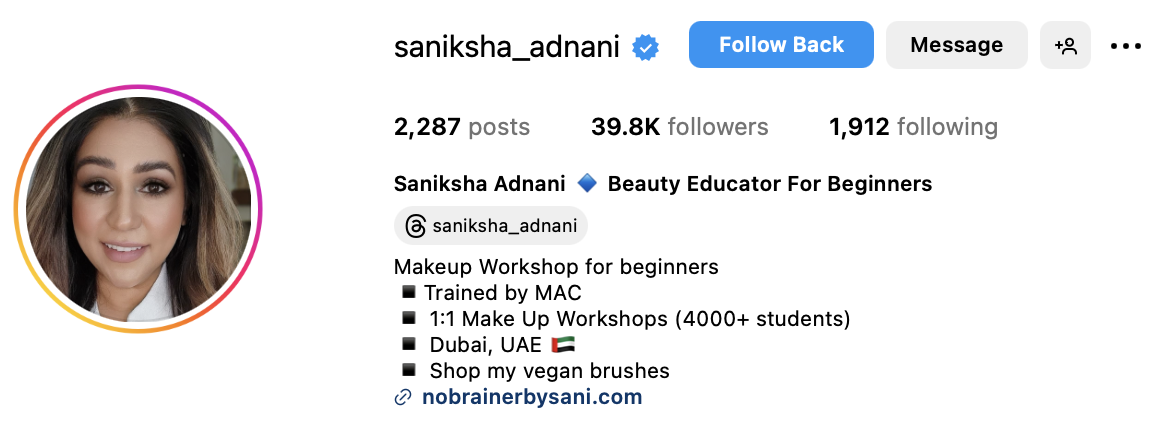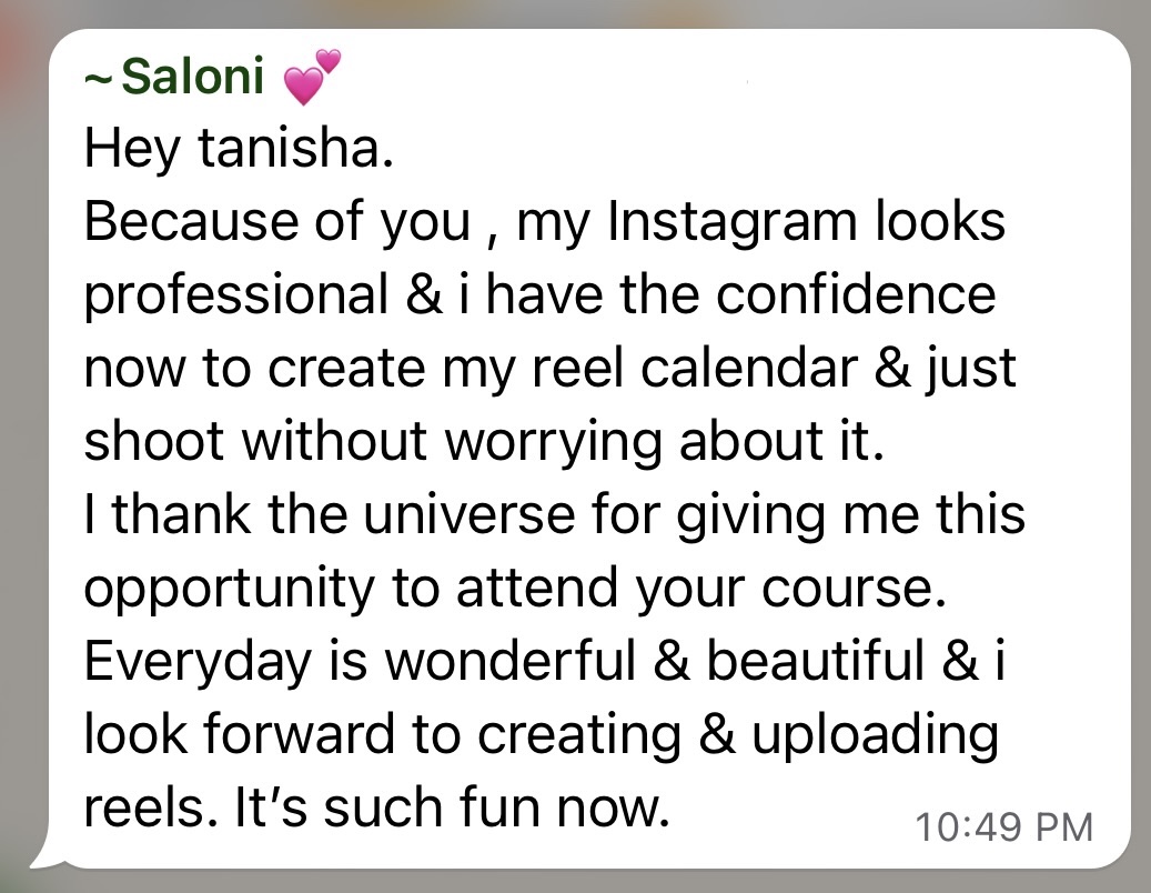 Saniksha, a makeup artist based out of Dubai, followed my startegies from scratch and she went from 7000 to 39k followers in no time, with reels reaching upto 1.9 million views + her sales boosted.