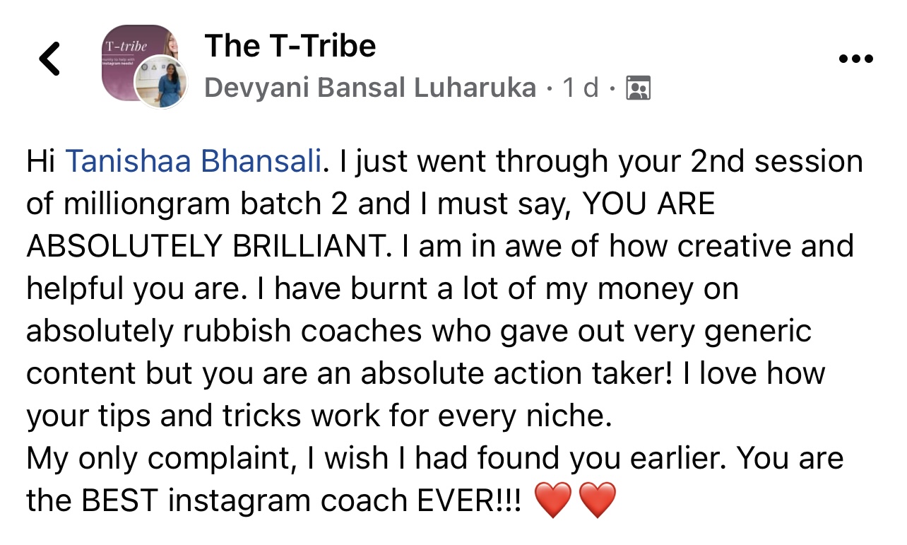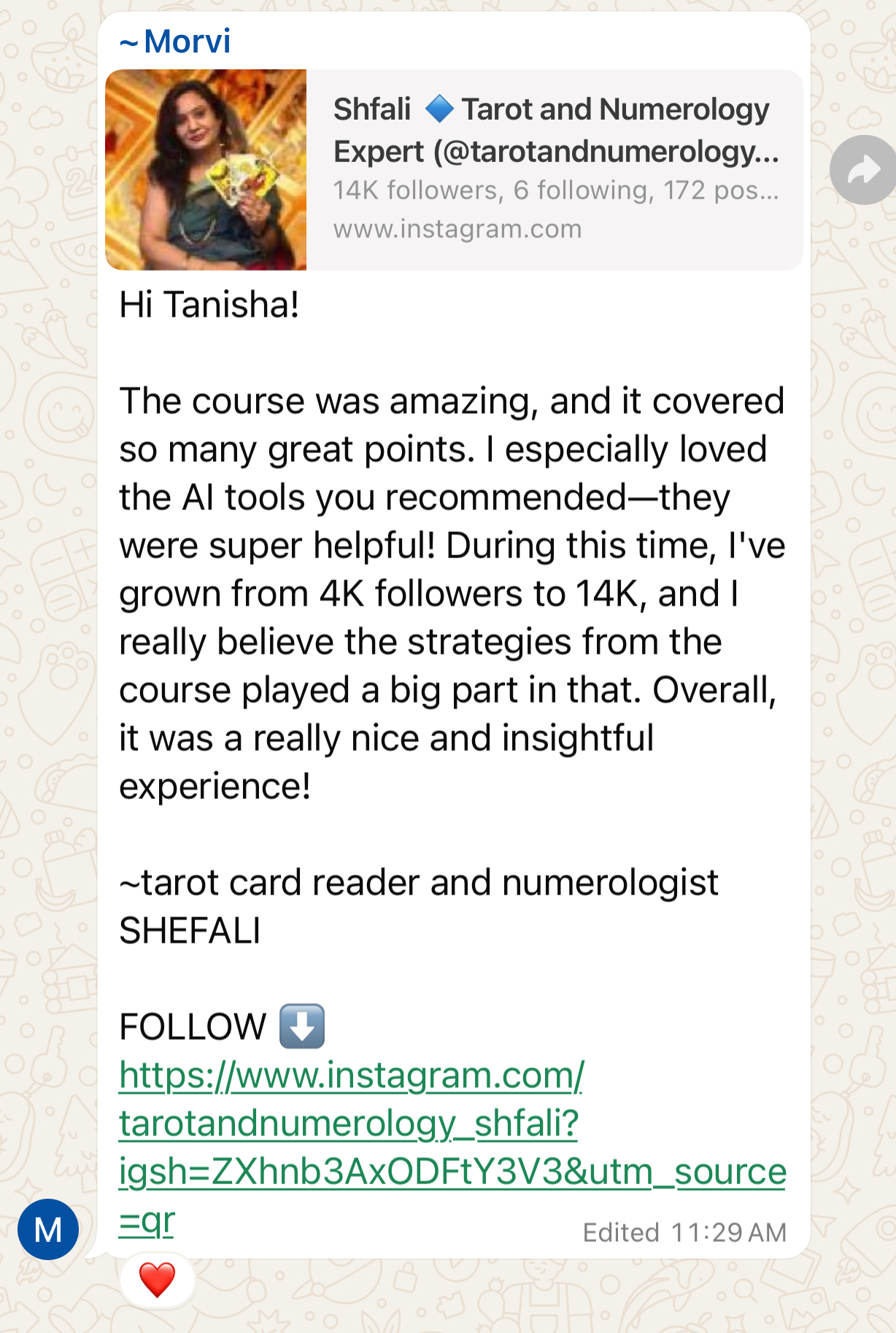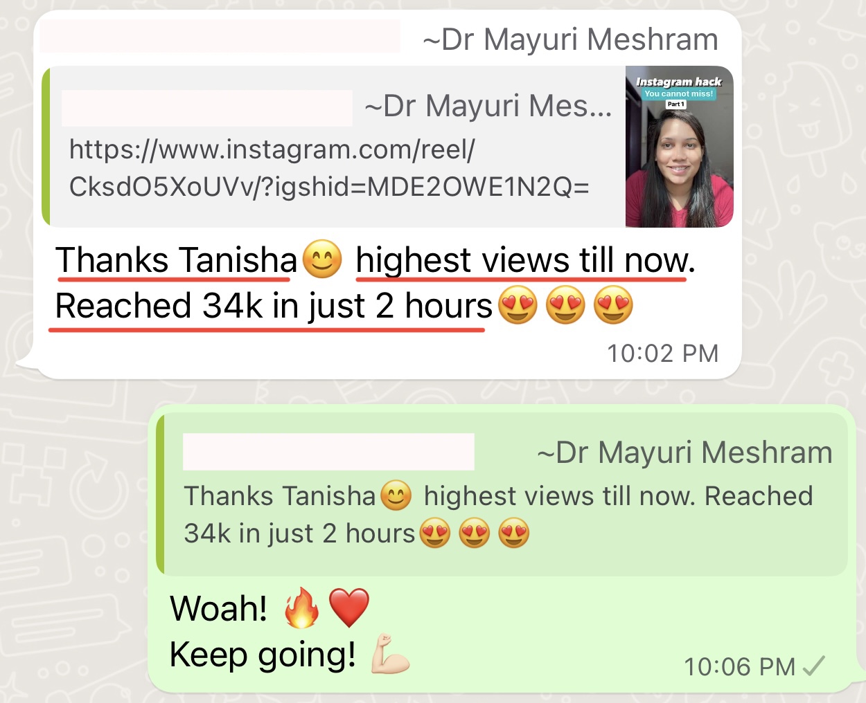Shuchi, the founder of Khumaar says: 'I couldn't attend the last two sessions. However, with the first 3 sessions itself I took my reach from 5k to 52k. Thank you so much for this insightful and affordable course.'