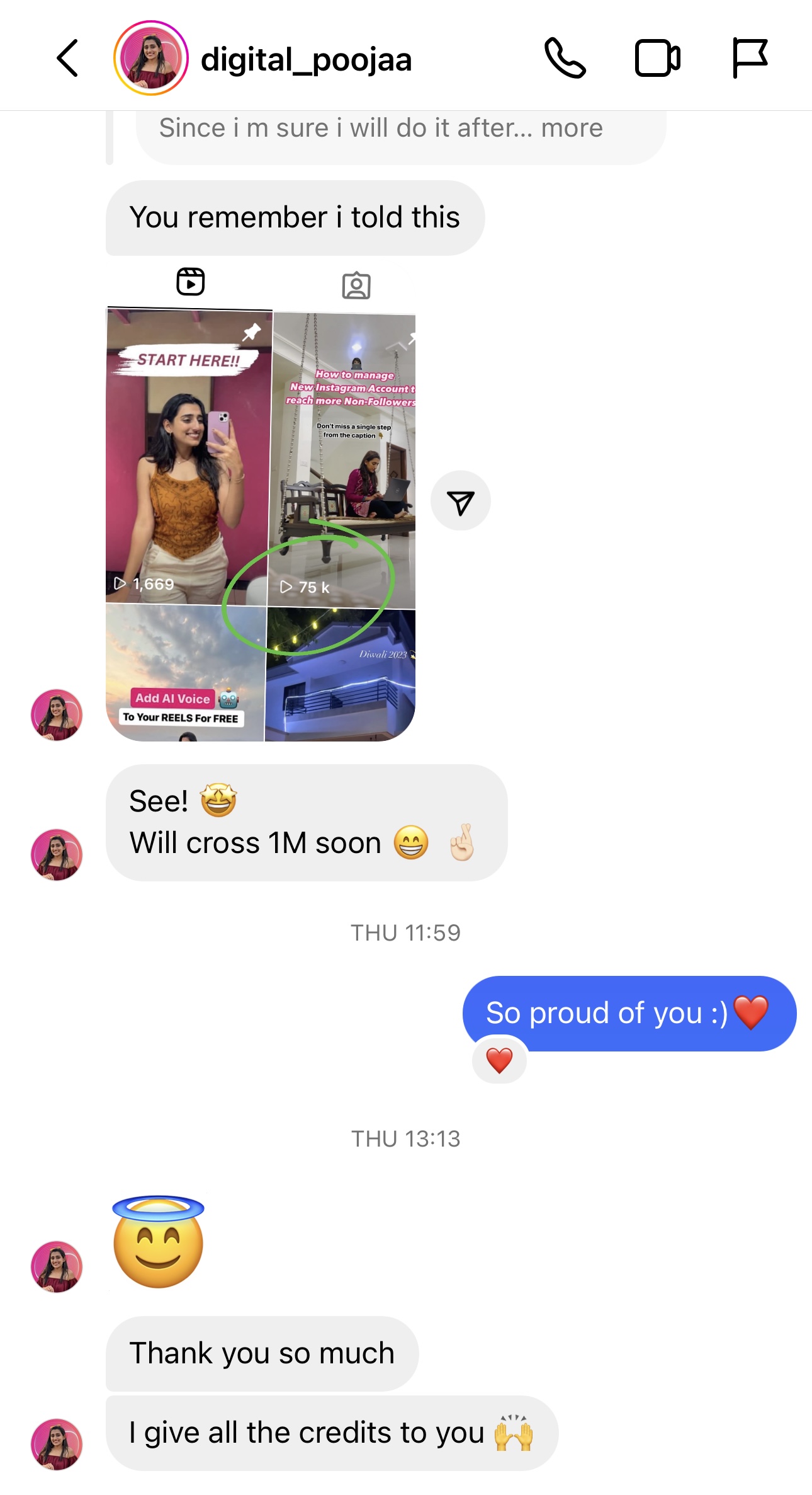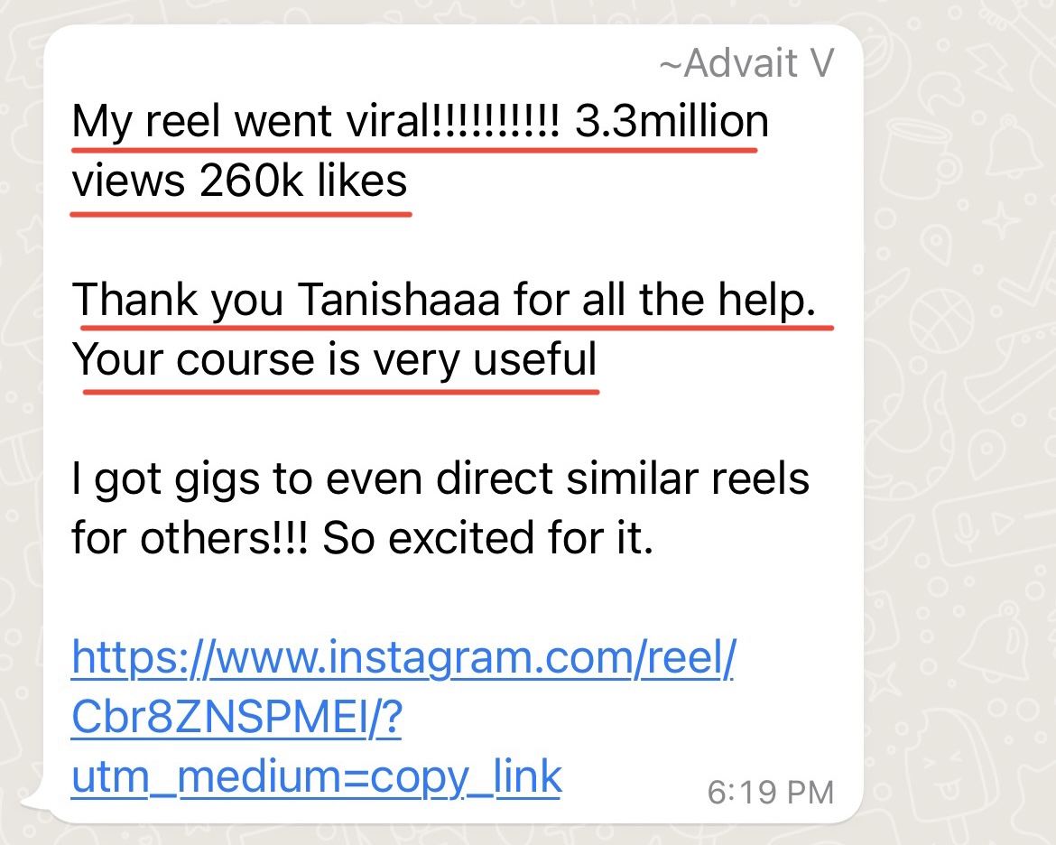 Shalini came to me when she was at 890 followers with no courses to sell. With the help of strategies she learnt over time, she built a strong foundation. Today, she crossed 400k followers and her highest reel views are at 33 Million.
