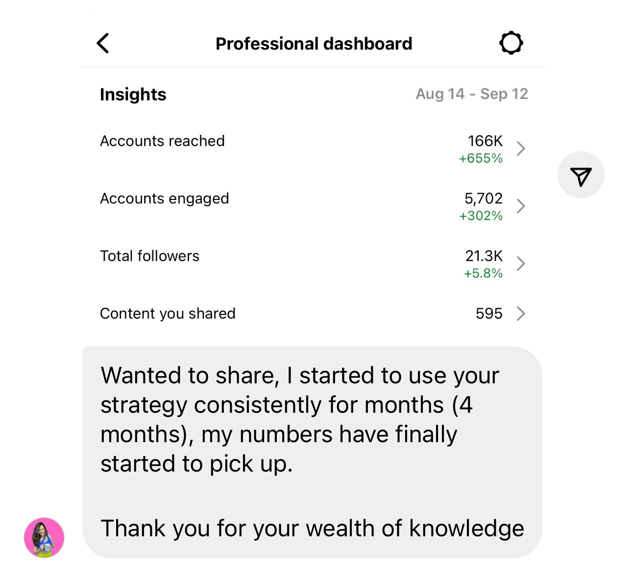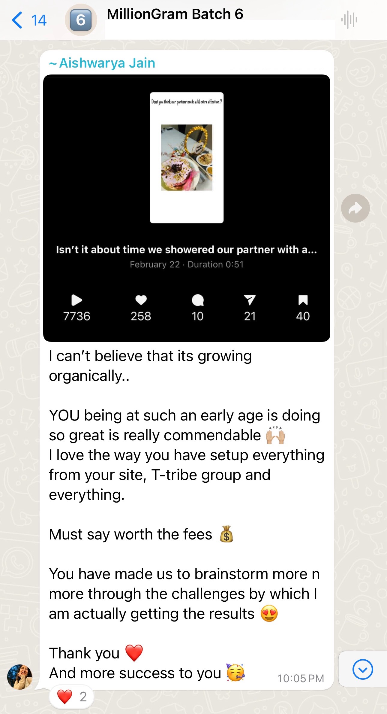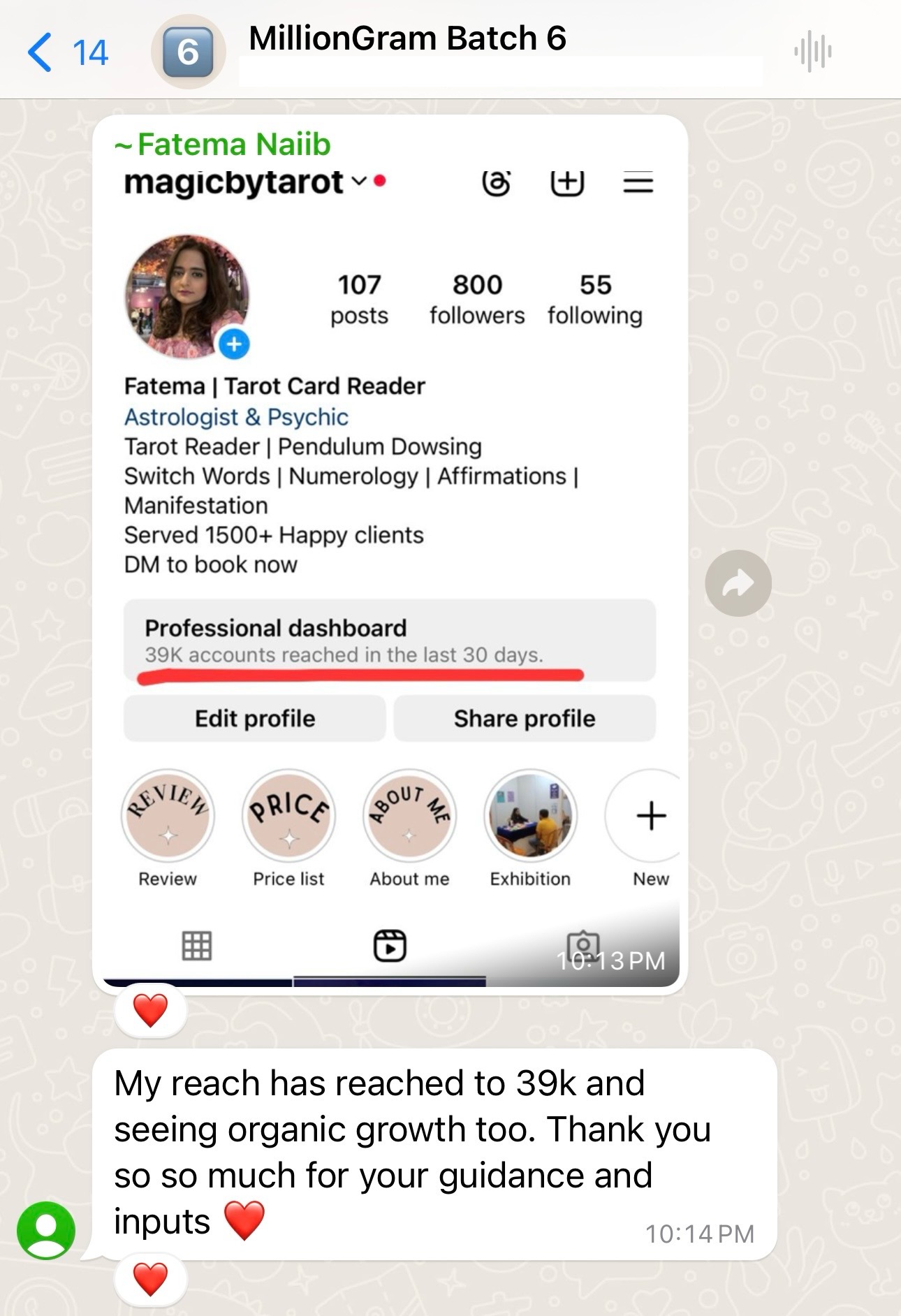 Saniksha, a makeup artist based out of Dubai, followed my startegies from scratch and she went from 7000 to 39k followers in no time, with reels reaching upto 1.9 million views + her sales boosted.